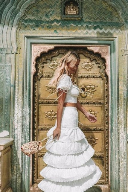 Конечно, длинные юбки – это вещь на любителя. Однако этот вариант в стиле бохо с воланами и вставками из кружева точно понравится многим. Конечно же, в трендовом белом цвете. Но и не забывайте о юбках миди, без них не обойдется ни в этом, ни в следующем сезоне. Посмотрите на 6 трендовых юбок миди лета 2019.