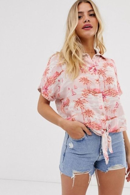 Это вариант для тех девушек, которые не очень любят платья и юбки. Это очень комфортный и стильный образ. Сочетайте короткие шорты с равной отделкой и широкую рубашку. Проявите фантазию и выберите какой-нибудь необычный верх. Например, вот такую рубашку с короткими рукавами, завязками снизу и рисунком с пальмами.
