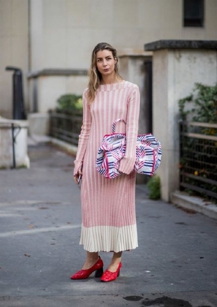 Среди модных цветов сезона нередко можно увидеть розовую пастель. Вязаные вещи всегда будут в тренде и они идеально подходят для прохладных дней. Меняя обувь, вы сможете превращать такое платье то в будничный наряд, то в наряд для прогулок по пляжу. Хорошим дополнением станет вместительный шоппер или модные пляжные сумки.