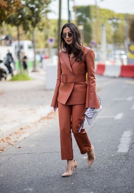 Вы ищите стильный офисный наряд? Тогда удивите коллег необычным костюмом с расклешенными рукавами. Светлые коричневые цвета хоть и немного поступились своими позициями, но из моды все равно не выходят. Такой одноцветный образ будет хорошо смотреться с нюдовыми туфлями.