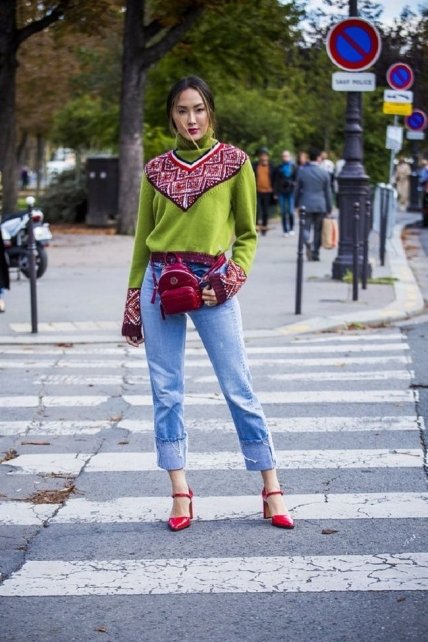 Разве можем мы обойти стороной наряды с джинсами? Удивите всех необычным решением, сочетая будничный свитер с забавным орнаментом вместе с изысканными туфельками. Под низ наденьте элегантный топ или боди. Когда погода потеплеет, просто снимите свитер и вы превратитесь в светскую львицу.