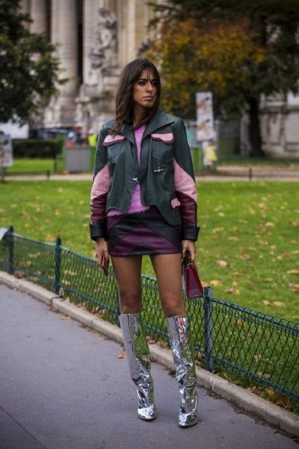 Поклонницы стиля ретро могут смело привносить в свой гардероб образы прошлых лет. Как вам привет из 1980-ых с их тягой к микро-юбкам и вещам с разноцветными вставками? Серебристые сапожки напоминают о буме диско и смотрятся игриво. Ну а сочетания с кожаными куртками останутся популярными этой осенью, благодаря стильности и комфорту. В жаркий день курточку можно просто снять.