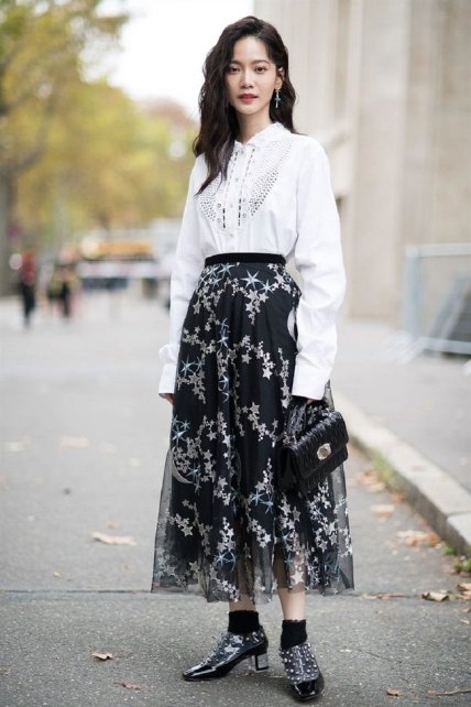 Изумительная летняя юбка из легкой ткани с подкладкой придает женственности строгой блузе, застегнутой на все пуговицы. Обязательно пополните свой гардероб юбками средней длины, поскольку сейчас в моде образы с миди-юбками. Чтобы ножки не замерзали, дополните наряд гламурными ботиночками с кружевными носками-чулками.