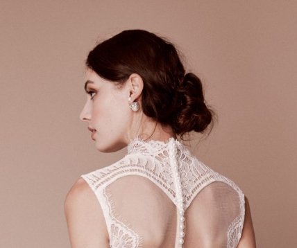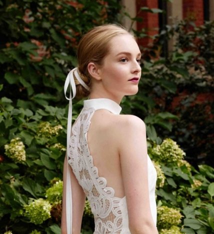 Тренды в свадебных прическах постоянно меняются, и вот снова в моде укладка, украшенная лентами. На этот раз это не фантазийные переплетения, а простая атласная ленточка, украшающая пучок на затылке. Модный тренд демонстрирует прическа невесты от Lela Rose. Гладко зачесанные назад волосы акцентируют внимание на лице и подчеркивают красивый высокий лоб юной невесты. Укладка с лентами гармонично сочетается с открытым платьем, которое украшено изысканным кружевом.