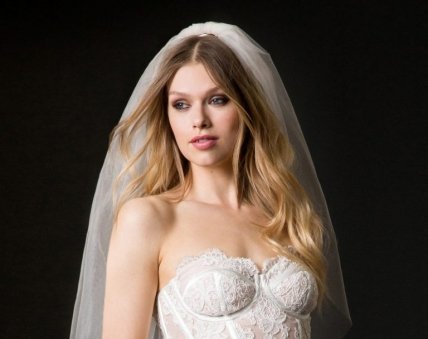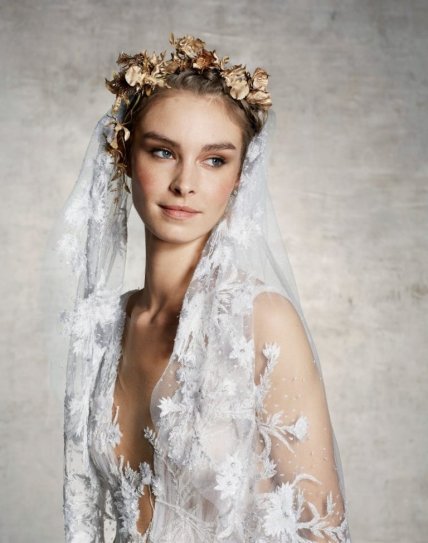 Свадебный венок с искусственными цветами может использоваться в качестве самостоятельного элемента декора или вместе с фатой. Свадебные прически с фатой предлагают дизайнеры модного дома Marchesa. Обратите внимание: чем пышнее укладка и украшения на голове, тем более скромной должна быть фата, чтобы не перегружать образ. Любительницы роскошных образов выберут пышные украшения в стиле Temperley London или Reem Acra, как на двух следующих фотографиях. Стрижку каре с укладкой волнами можно украсить одной крупной орхидеей или цветочным ободком. Прически на длинные волосы тоже великолепно смотрятся с ободком.
