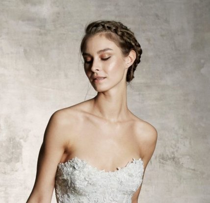 Для романтичных невест представляем два варианта модных причесок на свадьбу. Первый – это объемная коса на бок с выпущенными около лица прядями. Эта укладка хорошо подойдет для образа в стиле бохо или для винтажного платья, как у Temperley London. Чтобы повторить свадебную прическу от Marchesa, нужно сделать косой пробор, а затем плести косу вокруг головы и назад, постепенно добавляя пряди. Эта укладка гармонично сочетается с открытыми свадебными платьями и пышными юбками.