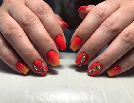 Маникюр омбре, градиент на ногтях с рисунком, стразами