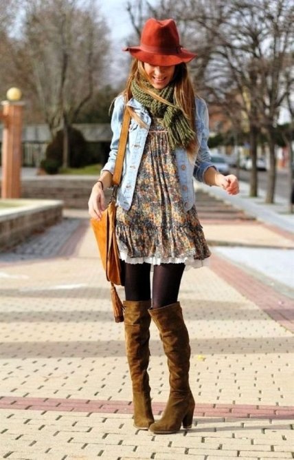 Коротенькое платье с оборками всегда хорошо смотрится в сочетании с джинсовой курткой и высокими сапогами. Получается некая середина между бохо и стилем кантри. Богемные наряды можно создать с помощью крупных шарфов.