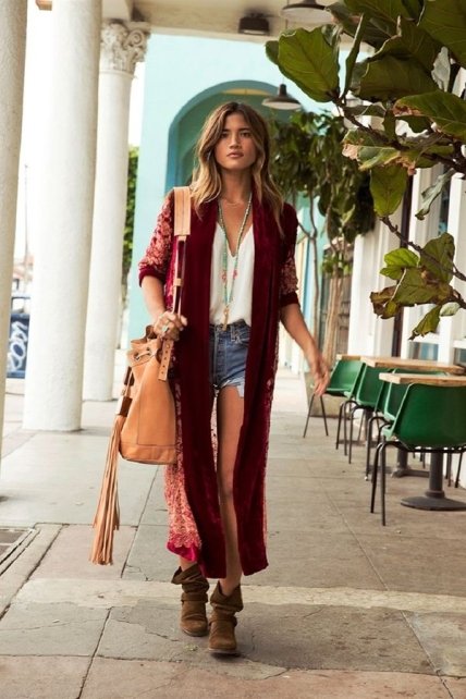 Если в воздухе уже появилась осенняя прохлада, но дни еще теплые, то не спешите отказываться от любимых шортиков, ведь можно создать немало сочетаний с джинсовыми шортами. Для стиля бохо великолепно подойдет накидка, которую можно дополнить ботиночками из мягкой замши.