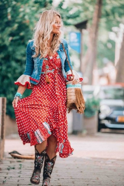 Еще один вариант безупречного примера богемного стиля. Выбирайте летнее платье в стиле «джипси». Например, красное платье-халат с запахом и оборками. Мелкий принт – удачное решение. Вы сами можете превратить обычную джинсовую куртку в богемную вещь, если пристрочите расклешенные рукава с воланами. Сюда подойдут любые ковбойские сапожки, но вариант с вышивкой наверняка подчеркнет ваше понимание тенденций бохо. Сумка из соломы с бахромой и аксессуары завершат образ.