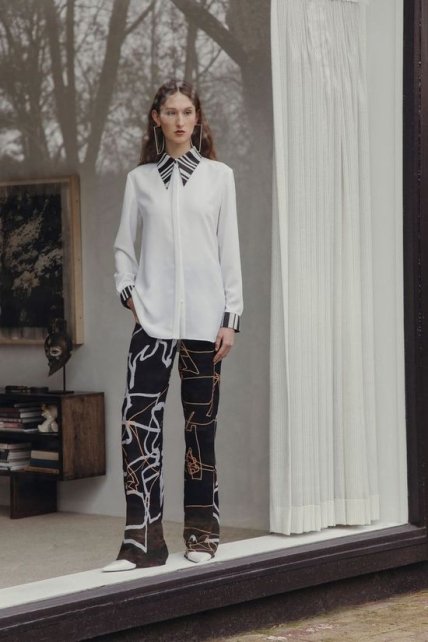 Jeffrey Dodd демонстрирует, что не джинсами едиными живет модница. Темные широкие брючки с непредсказуемым узором освежаются белой прямой рубашкой. Строгий узор на воротнике в черно-белую полоску противоречит безумному принту на брюках.