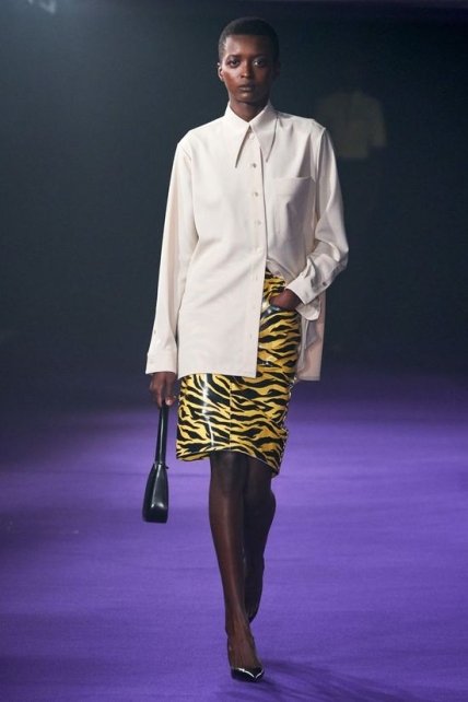 Kwaidan Editions демонстрирует, как славно удлиненная белая рубашка сочетается с узкой юбкой в анималистическом исполнении. Черный узор зебры на желтом фоне – разве может быть дополнение лучше?