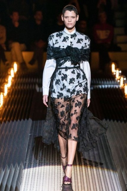 Дизайнеры от Prada пошли еще дальше. Они предлагают надеть рубашку под полупрозрачное платье! Черные цветочки, кажется, висят в воздухе, а на линии груди вставка более ощутимая.