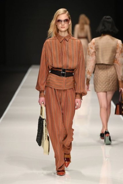 Fendi сочетает свободную рубашку с объемной юбкой. Цветовое решение этого образа интересно тем, что оттенки всех элементов входят в одну гамму. Здесь нет контраста, а есть лишь плавный переход, градация.