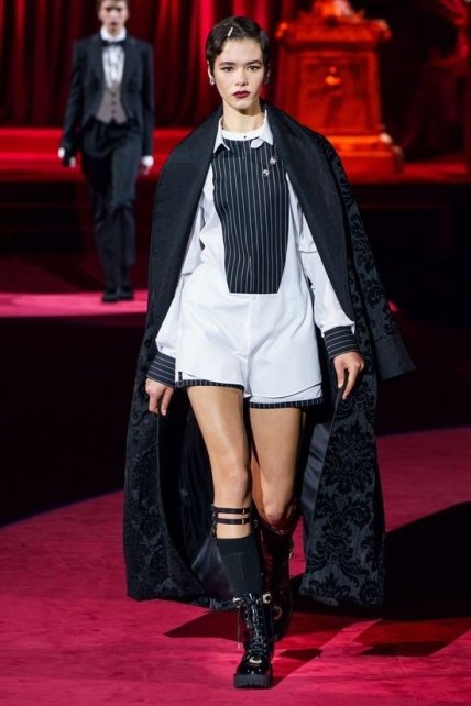 Образ от Dolce & Gabbana интересен не только дуэтом рубашки и гольф. Привлекает здесь и цветовое решение. Черно-белая вставка на груди перекликается с манжетами в таком же оформлении. Венчает всю эту красоту огромное пальто, наброшенное на плечи.