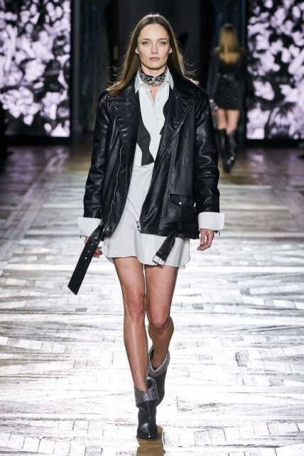 Длинная белая рубашка в образе Redemption выглядит совсем как мини-платье. Кожаная куртка несколько короче ее, что создает гармоничный образ. Хороший вариант на теплую осень.