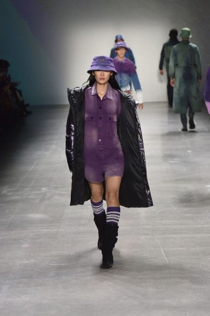 John John демонстрирует еще один образ, основанный на этом дуэте. Женская длинная рубашка доходит до колен, словно платье. С ней сочетаются гольфы с уютными черно-белыми полосками, длинное пальто и дерзкий головной убор, напоминающий панаму.