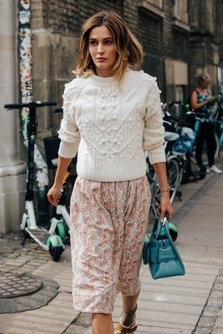 Юбки миди с принтом стали триумфаторами сезона весна-лето 2019. Холодный сезон тоже не пройдет без этой стильной вещи. Но, конечно, сочетать эту юбку нужно с теплым белым свитером! Выберите свитер с классическим принтом (с цветами или ромбиками). Можете довершить образ аксессуаром с трендовым животным принтом. Например, выберите небольшую сумку со змеиным или леопардовым принтом. Чем не идеальный аксессуар для осеннего образа? Эта вещь добавит довольно спокойному образу оригинальности и стиля.