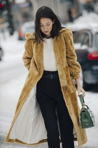 Это сочетание прекрасно подойдет для офисного образа. Вам понадобятся три простые вещи для его создания: брюки черного цвета, длинное меховое пальто, стильная сумка яркого цвета и, конечно, белый свитер. Идеальный осенний образ на каждый день.