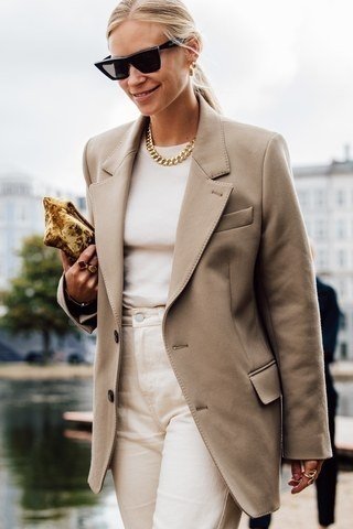 Если в прошлом году мир моды сходил с ума по пиджакам коричневого цвета, то в этом году популярность перешла к пиджакам песочного цвета. Это идеальная вещь, чтобы дополнить образ в белом цвете. Создайте стильный осенний образ с белыми джинсами на высокой талии, белым свитером, пиджаком песочного цвета и золотистыми аксессуарами. Эти детали разбавят довольно спокойный образ поастельных оттенков.