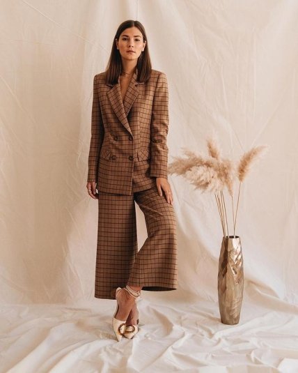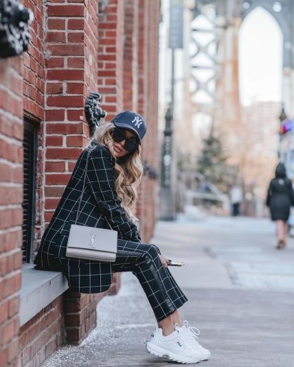 Вы также можете приобрести клетчатый брючный костюм, который станет элегантным дополнением вашего повседневного лука. Кроссовки, кепка и стильная небольшая сумка на плечо станут изюминками наряда.