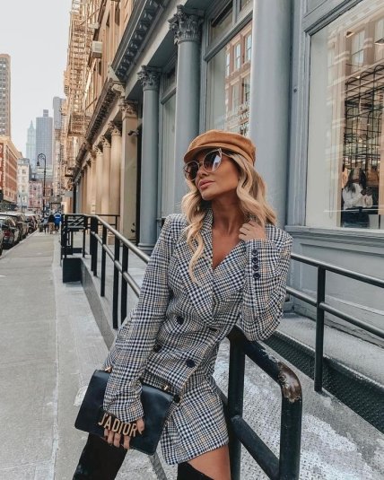Так, вы можете прикупить стильный жакет-платье, который чудесно будет работать с удлиненными сапогами ботфортами, клатчем, а также интересным кепи.
