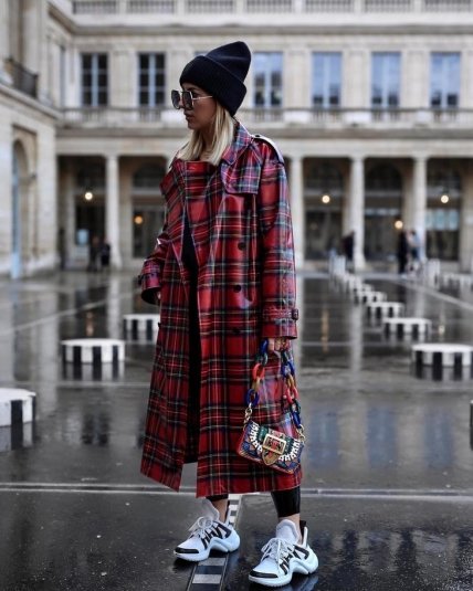 Интересно принт клетка будет работать на пальто, которое специалисты предлагают дополнить вязаной шапкой бини, полувером, лосинами, а также кроссовками.