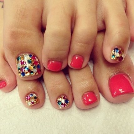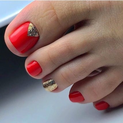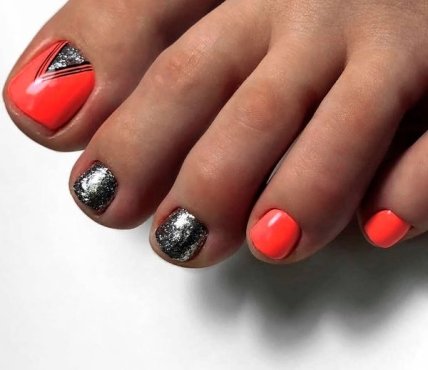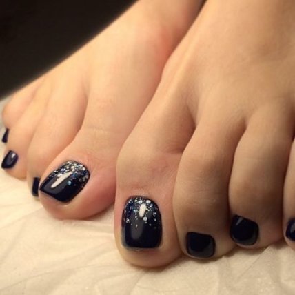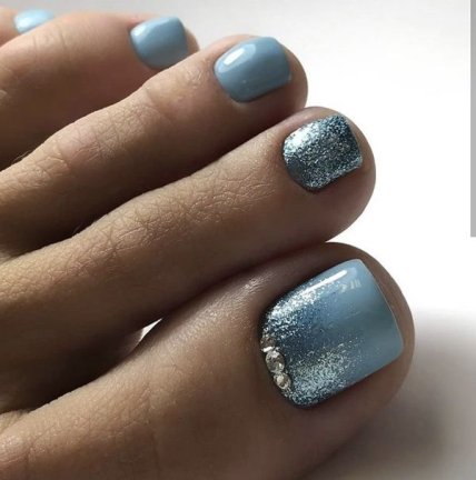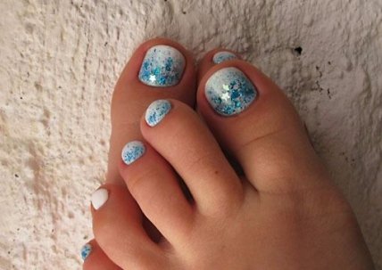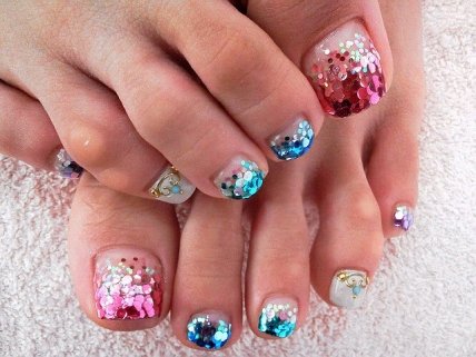 Для создания педикюра с наличием блесток воспользуйтесь глиттерным лаком . Если же ваши предпочтения более обширны, то воспользуйтесь более сложными идеями украшений в педикюре: используйте камифубуки, битое стекло, бульонки, технику втирки.