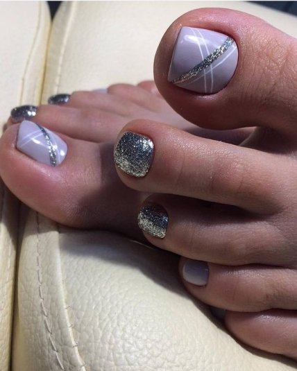 Обдумывая оформление пальчиков на ногах, прибегните к минимализму. Меньше — значит лучше. Вот основной девиз аскетичных барышень. Достаточно нанесети полоски из глиттера по центру ноготка либо же поставить точки достом — интересный неоклассический декор готов.