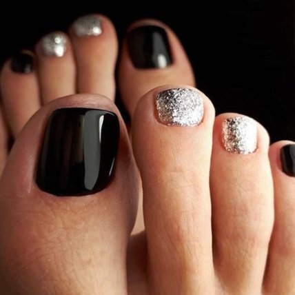 Французский маникюр и педикюр — нестареющая классика. Но даже она может наскучить. Не спешите забывать о прорисовывании линии улыбки, вот только делайте ее не четкой, а более смазанной либо же, наоборот, графичной. Также можно сделать черный педикюр с блестками на месте белоснежных лунок. Выйдет весьма эффектно.
