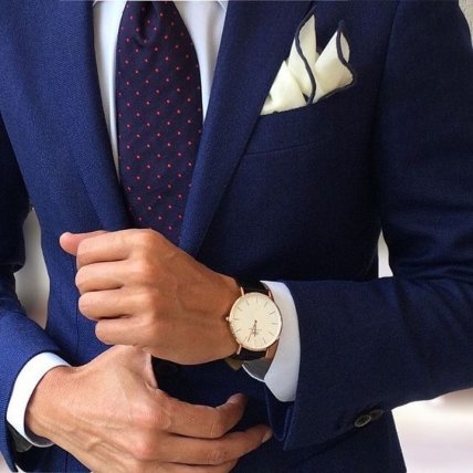 Синий галстук средней ширины с незаметным рисунком и белый платок (для нагрудного кармана пиджака) станут прекрасным завершением классического образа. Носите их вместе и отдельно. В зависимости в каком вы состоянии хотите быть. Бизнесмен, церемония с красной дорожкой или Vip– room в клубе.
