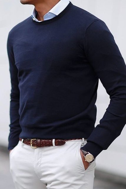 С круглым или V- образным вырезом из тонкого кашемира. его можно носить круглый год (за исключением жарких летних дней). Хорошо сочетается с брюками, джинсами, пиджаком. Советуем при покупке пуловера из кашемира не пугаться, что появятся катышки. Купите машинку по удалению лишней шерсти и пуловер будет всегда как новый.