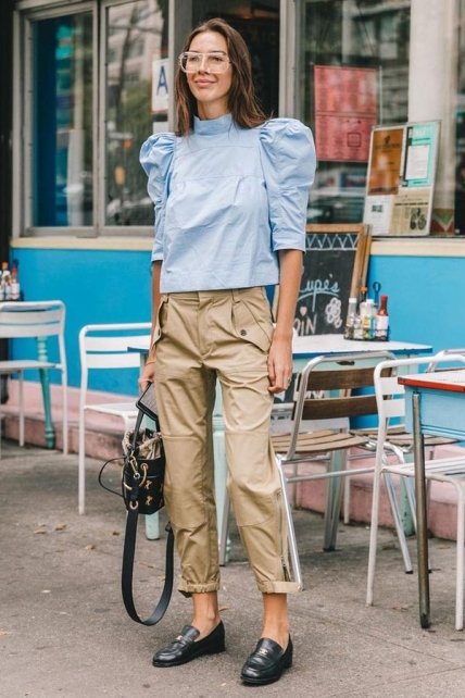 Мы просто влюбились в этот образ, ведь он чрезвычайно актуален этой осенью. Блуза с пышными рукавами (тренд сезона) станет центральной вещью всего образа. Штаны в стиле милитари все еще остаются в моде. Если объединить эти две вещи и добавить классические туфли на низком ходу, то получится замечательный образ, который подойдет как для офиса, так и для вечеринки. Пышные рукава появились этим летом и отказываются сдавать позиции. Ищите блузы, пальто, топы и даже платья с воланами на рукавах. Успех гарантирован! В этом образе штаны в стиле милитари немного теряют свою былую брутальность. Нейтральный крой с элементами милитари – самый идеальный вариант. Кроме того, этой осенью мы можем наслаждаться туфлями на плоской подошве и чувствовать себя комфортно в классических мокасинах. Сюда хорошо подойдет обувь в мужском стиле.