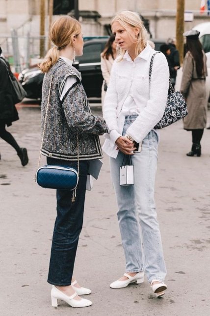 Стиль этих двух женщин в полной мере показывает, что нужно носить этой осенью. Вещи в винтажном стиле будут окружать нас со всех сторон! Пиджаки из твида в стиле дома моды Chanel и элегантные туфли на небольшом каблуке белого цвета точно должны быть в вашем гардеробе. Да, сезон осень-зима 2019/2020 тяготеет к классическим вещам, которые виртуозно создает бренд Chanel. Посмотрите на их показ на Неделе высокой моды в Париже и убедитесь сами.Однако важно сочетать эти вещи с более простыми трендами, чтобы избежать официальности. Например, с этими милыми белыми туфлями с тонким ремешком, которые придают наивности любому образу. Не обязательно выбирать однотонные туфли белого цвета. Ищите обувь с необычными деталями. Все эти образы выглядят винтажно, стильно и оригинально.