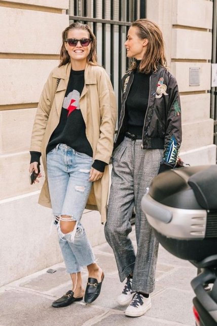 Два комфортных и стильных осенних образа. Широкие и прямые джинсы идеально сочетаются с классическим тренчем и простым черным свитером. Прямые брюки с принтом в клетку лучше носить с бомбером с вышивкой и белыми кроссовками. Тренч практически никогда не выходит из моды, но каждый сезон он приобретает новые формы и оригинальные детали. Сезон осень-зима 2019/2020 предлагает забыть о классическом варианте и приобрести широкий тренч со спущенными плечами. Попробуйте избежать строгости и официальности. Широкие и прямые джинсы тоже не новинка в мире моды, но именно сейчас они будут на пике популярности. Наверняка вы уже успели заметить эту модель в образах фешн-блогеров, не так ли? А вот брюки на высокой талии с принтом в клетку нужно обязательно приобрести для осенних образов. Они очень удобные и сочетаются практически с любой вещью. Белые кроссовки и бомбер разрушат их формальность и строгость. Излюбленные бомберы тоже возвращаются в моду, но с оригинальными деталями: вышивкой, стразами, перьями… Отдайте предпочтение нетрадиционным вариантам. Ну а белые кроссовки уже несколько сезонов входят в список тенденций! Белая обувь вообще завоевала огромную популярность.