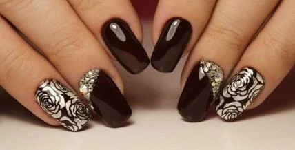 Матовый фон шоколадного цвета - беспроигрышный выбор для осеннего образа. Хотя узоры с цветами принято считать традиционно летними и весенними, стилисты говорят, что цветочные принты не выйдут из моды в текущем осеннем сезоне. Можно добавить дополнительный акцент с помощью замысловатых завитков из стразов и выкрасить по одному ноготку на каждой руке в золотистый цвет.