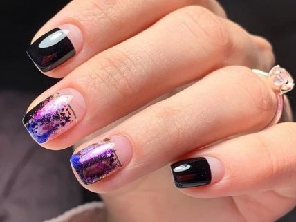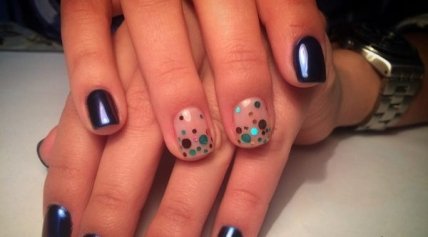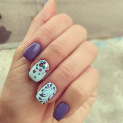 Он прекрасно сочетается с белым, черным, бежевым, розовым, сиреневым и серебристым цветом. Вы можете дополнительно украсить такой маникюр легким рисунком, блестками или парой страз.