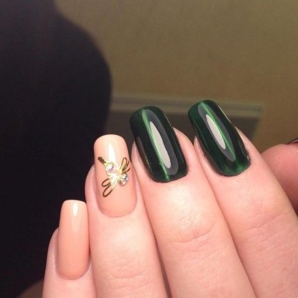 Но самым красивым и волшебным считается покрытие в технике кошачий глаз. Именно здесь изумрудный цвет открывается по-новому, поражая красивой игрой красок.