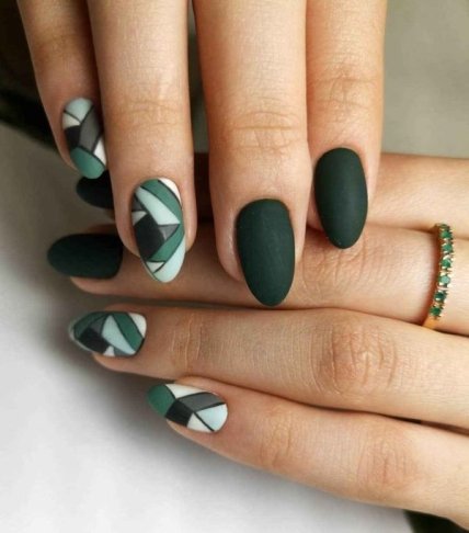Более спокойный и стандартный выбор – это изумрудный маникюр в глянцевом исполнении. А вот матовость придаст вашему маникюру некой особой изюминки.