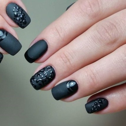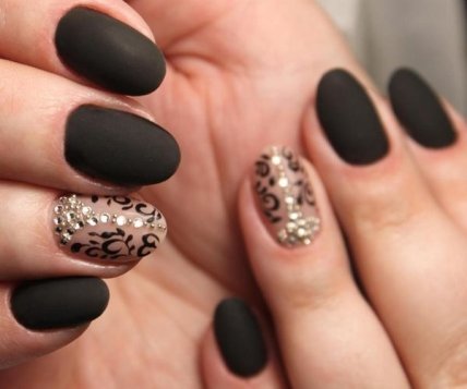 Женщины часто выбирают пыльцу для украшения ногтевой пластины. Декорируя черный классический матовый маникюр, вы также можете использовать кристаллы или сделать омбре.