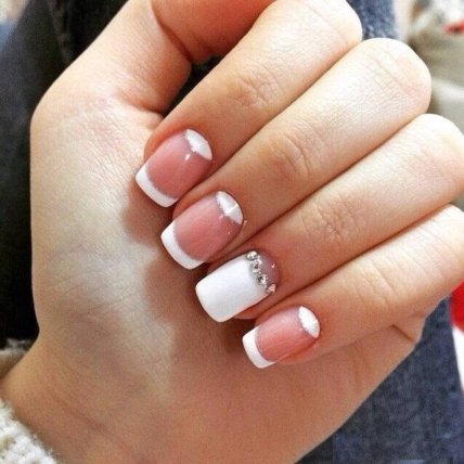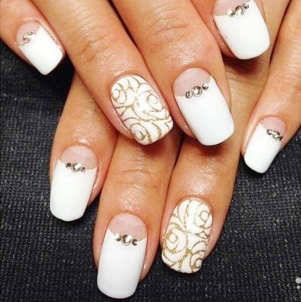 Классический френч отлично смотрится в свадебном образе. Но лунный маникюр выглядит тоже достаточно элегантно и красиво. Рекомендуется для создания волшебного маникюра использовать нейл-арт. Цвета необходимо подбирать близкие к естественным. В случае, когда наряд невесты будет иметь яркие детали, можно применять насыщенные оттенки.