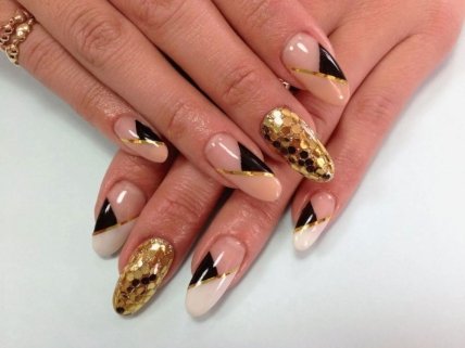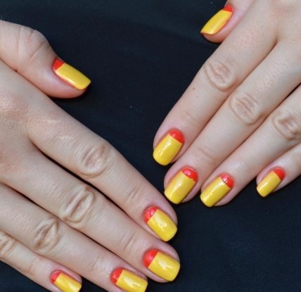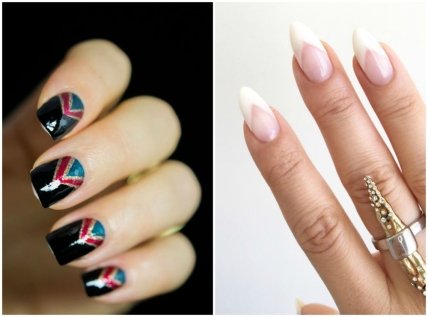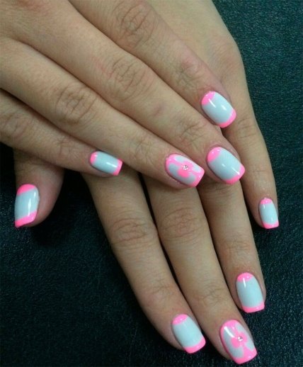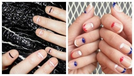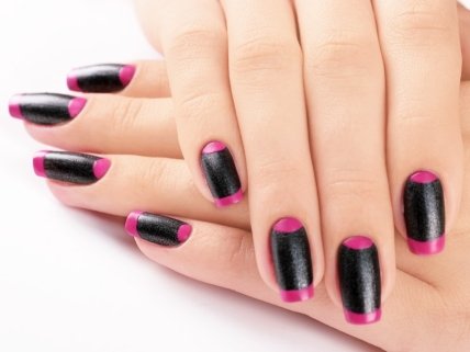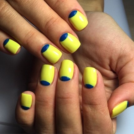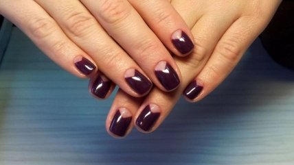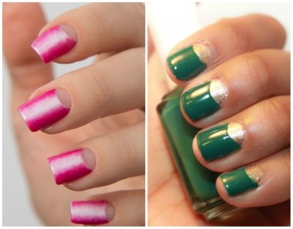 Актуальный вариант, совмещающий в себе два вида маникюра. Основу пластины покрываем одним цветом, а лунку и кончик – другим. Также интересный вариант, когда лунка покрыта прозрачным лаком или вообще не окрашена, основа яркого цвета, а улыбка кончика ногтя окрашена пастельным оттенком.