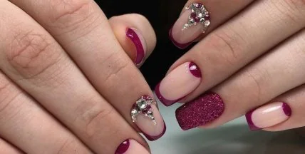 Актуальный вариант, совмещающий в себе два вида маникюра. Основу пластины покрываем одним цветом, а лунку и кончик – другим. Также интересный вариант, когда лунка покрыта прозрачным лаком или вообще не окрашена, основа яркого цвета, а улыбка кончика ногтя окрашена пастельным оттенком.