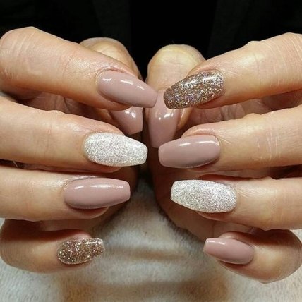 Разнообразить классический маникюр можно, выделив безымянный палец с помощью золотистого покрытия или глиттера подходящего оттенка. Это выглядит и строго, и нескучно одновременно.