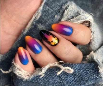 Переход оттенков делается слева на право, а не сверху вниз. Можно использовать 2 тона, которые плавно сменяют друг друга или несколько цветов лака.