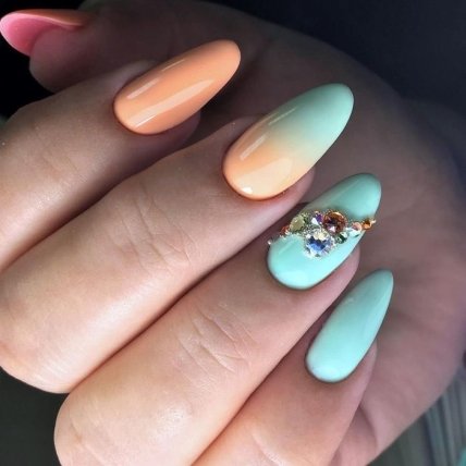 Сочетать градиент можно со следующим декором: Стразы, цветной песок или пудра, Минимальный флористический декор, Фольга или битое стекло.