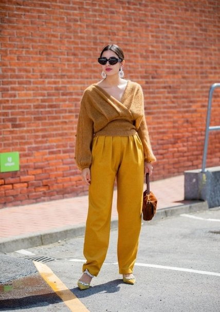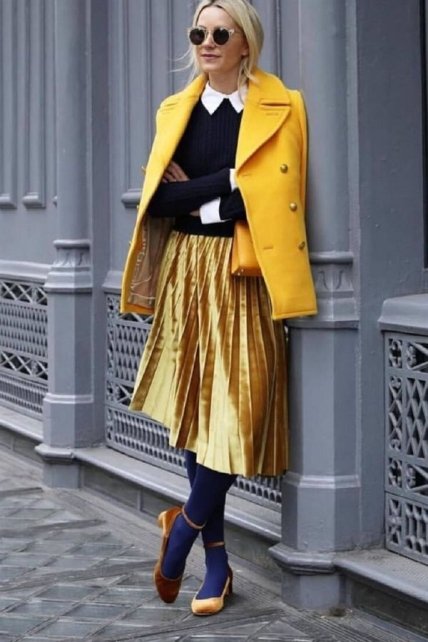 Для осеннего сезона актуальны теплые цвета, в том числе и оттенки желтого или оранжевого. В частности, спросом пользуются ткани горчичного цвета. Горчичные наряды универсальны и позволяют экспериментировать с разными стилями: от гламурного до уличного.
