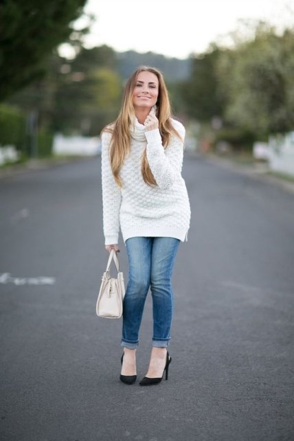 Сочетания с белым свитером позволят вам выглядеть непревзойденно. Практически любые вещи белой палитры смотрятся стильно, дорого и изысканно. Не ограничивайте свой выбор снежно-белыми нарядами. Выбирайте кремовые оттенки, цвет слоновой кости или модный сейчас оттенок космического латте. Так же стоит обратить внимание на вязаные крючком наряды.