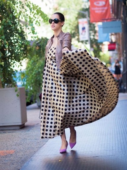 Узоры в горошек не выходят из моды вот уже несколько столетий. Умело подобранный размер принта позволяет создать стройнящий эффект. Классическим вариантом останутся контрастные наряды (в частности, черно-белые ткани) с пятнами одинаковых размеров. Однако можно найти и другие идеи, совмещающие пятнышки разных размеров. Если вы боитесь простоватого деревенского образа, то стоит обратить взор на элегантные материи. Шикарно будет смотреться пятнистое платье свободного кроя, сшитое из струящейся материи с блеском.