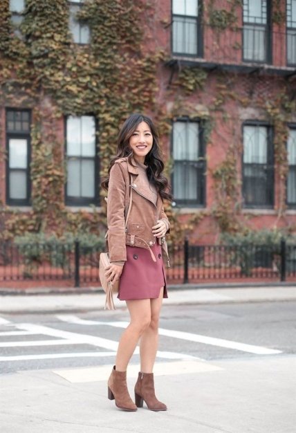 В этом сезоне на пике популярности все оттенки коричневого: от самых темных и насыщенных до мягких и нежных. Стильно и нарядно будет смотреться замшевая курточка цвета кофе с молоком. Образ помогут дополнить замшевые ботиночки схожего оттенка.